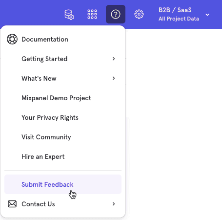 Should you have any feedback you want to share, simply click Submit Feedback in the Mixpanel UI.